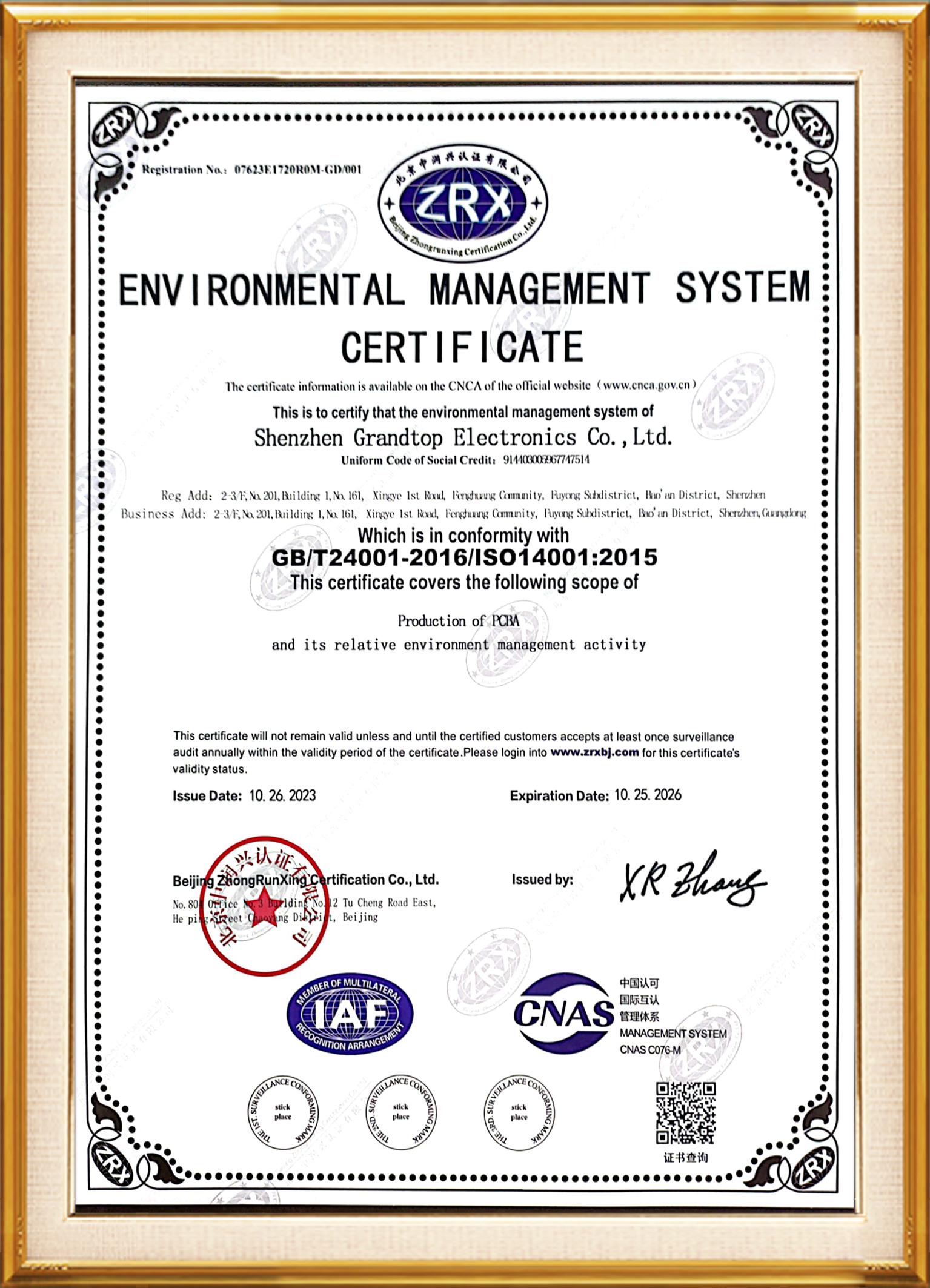 ISO14001环境体系证书(英文版)