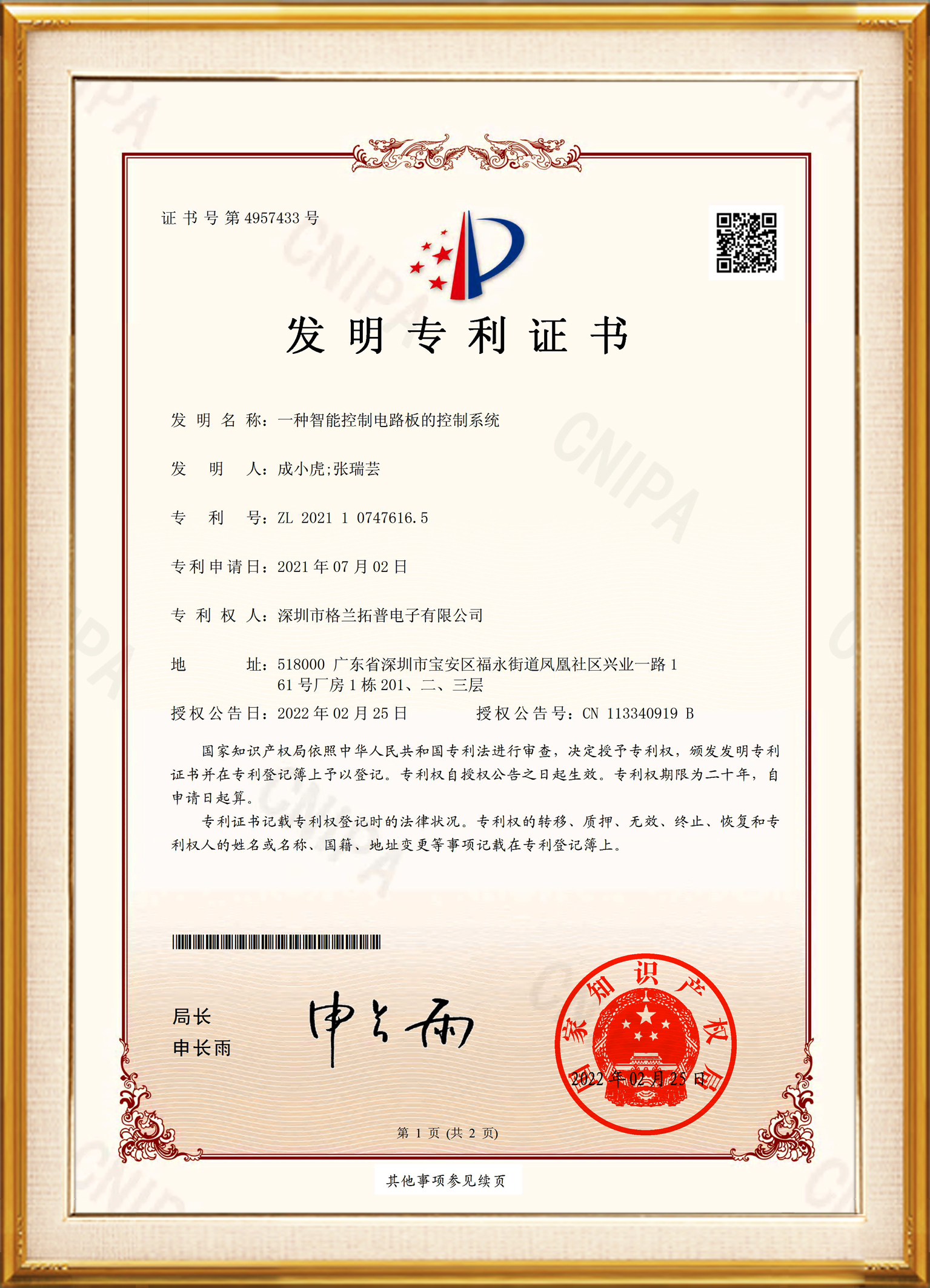 深圳市格兰拓普电子有限公司2021107476165发明专利证书