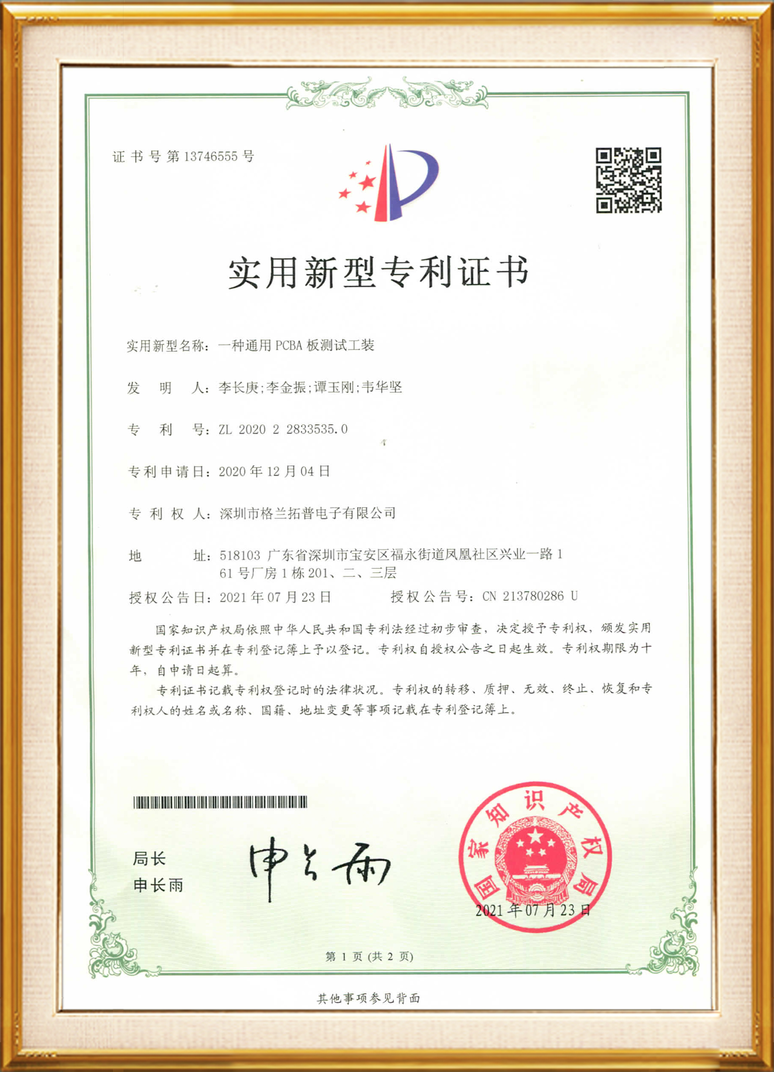 深圳市格兰拓普电子有限公司2021107476165发明专利证书